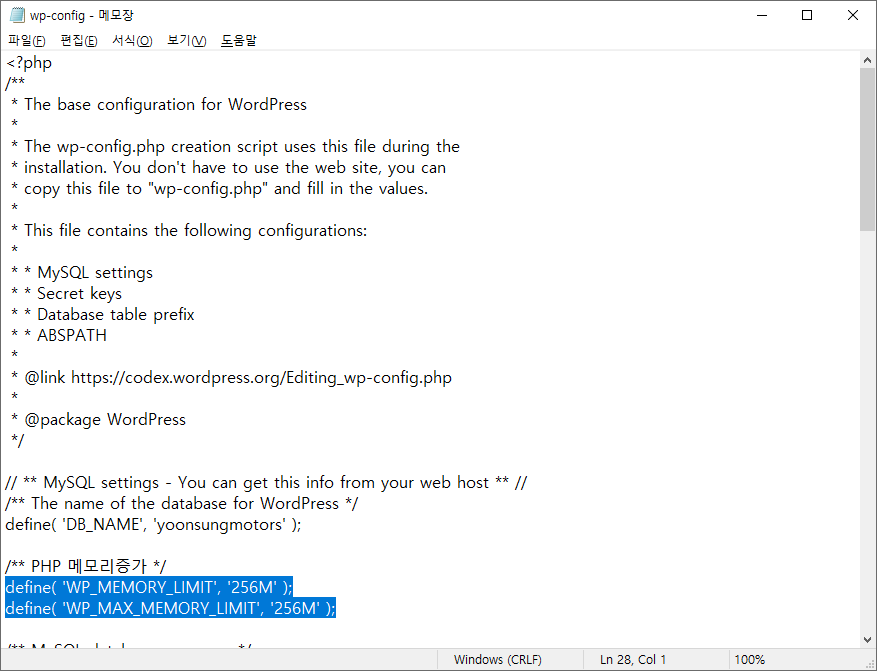 3. 메모장 또는 편집기로 다운받은 wp-config.php를 열고 <?php 바로 아래 정의에 다음과 같이 입력
